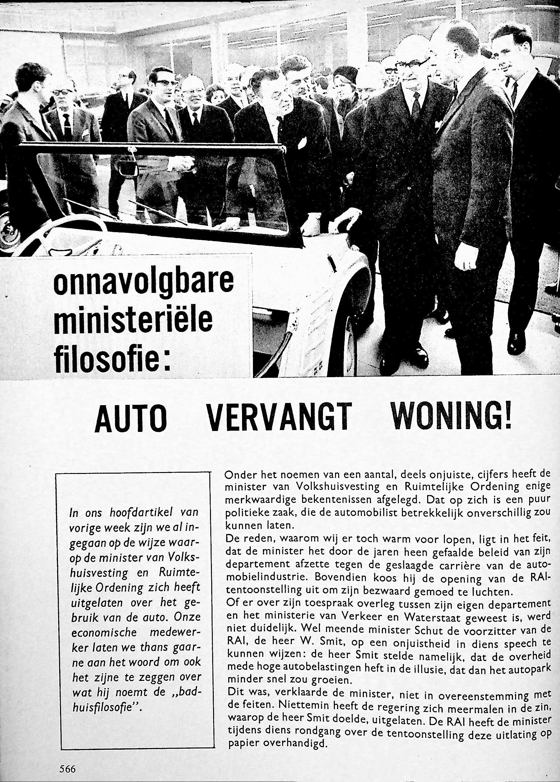 De redactie had flink wat commentaar op de wijze waarop de minister van Volkshuisvesting en Ruimtelijke Ordening zich uitliet over het gebruik van de auto. Hij beweerde dat de auto gemiddeld per dag 50 km aflegt en 22 uur stilstaat en dat wij bijna evenveel uitgaven aan een auto als aan een woning. Hij vond dat geen gezonde ontwikkeling. Dus men moest maar afzien van autogebruik en in het openbaar vervoer zitten. De redactie reageerde als volgt: "De gemiddelde Nederlander, rein als hij is, gaat per week 1 of 2 keer in bad of douche en toeft daar per keer, laat ons zeggen, een half uur. Dat is gemiddeld 5 a 10 minuten per dag. Aangezien de veelal krap bemeten woning nogal wat ruimte inneemt, is dit een ongezonde toestand. Pleiten we voor openbaar vervoer inslaat van auto's, dan bevelen wij met deze aard van argumenten ook het collectief baden - zij het dan wel met schotjes er tussen - aan. Het badhuis is ons enig alternatief en inderdaad veel rendabeler dan in elk huis een bad of douche aan te brengen." Zo ontstond de 'badkamerfilisofie'.