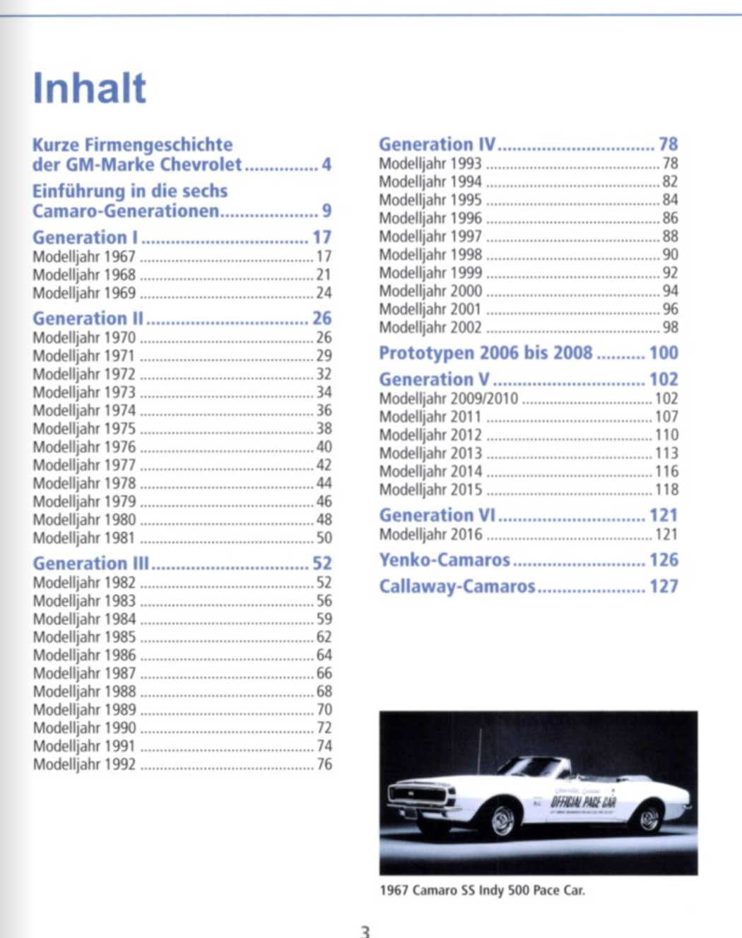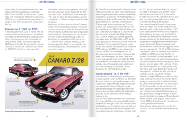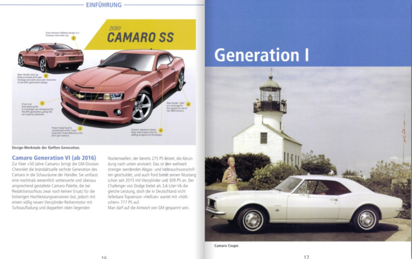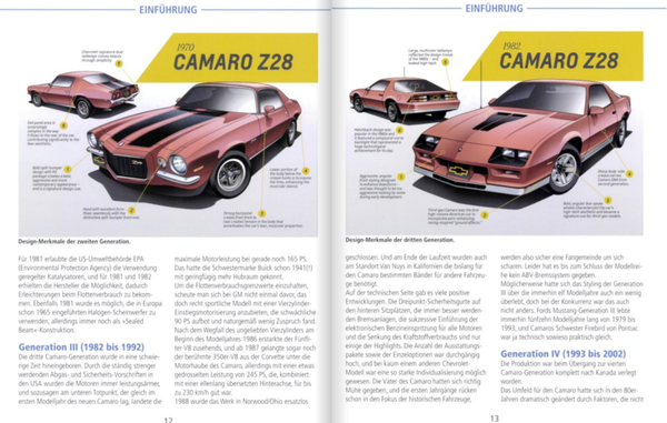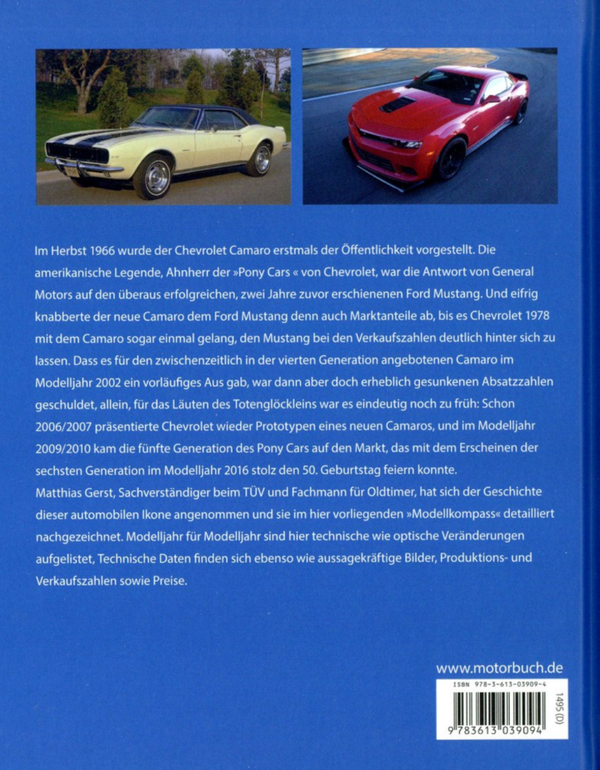 De eerste Chevrolet Camaro kwam uit in 1966. De Amerikaanse legende, voorvader van de naar hem vernoemde »Pony Cars«, wordt dit jaar 50. Echt een bijbels tijdperk, dat alleen al voldoende bewijs is van zijn succes. Maar auto's worden alleen zo oud als ze erin slagen met de tijd mee te gaan, altijd jong en up-to-date te blijven. Dit vereist tal van faceliftmaatregelen, technische verbeteringen en meerdere generatiewissels. Genoeg materiaal dus voor auteur Matthias Gerst om een modelkompas te lanceren voor een heel bijzonder voertuig.