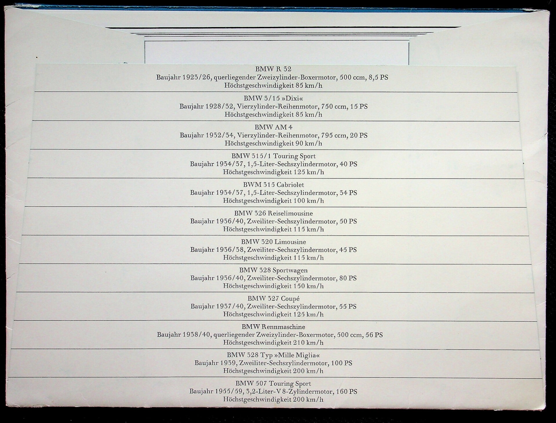 Map met hoogglanzende A4's met beroemde BMW-modellen. Helaas ontbreken 2 items van de motorfietsen
