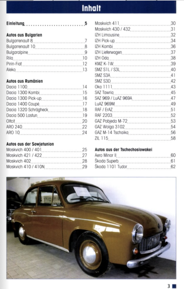 Veel in de overige Oostbloklanden geproduceerde autotypes waren in de DDR helemaal niet of alleen in basisuitvoering leverbaar. Het huidige werk beschrijft alle andere auto's, terreinwagens en bestelwagens met een laadvermogen tot één ton die in massaproductie werden geproduceerd in de voormalige Oostbloklanden Bulgarije, Roemenië, de Sovjet-Unie, Tsjechoslowakije, Polen en Joegoslavië. zodat alle drie de delen samen een uitgebreid overzicht geven van de verscheidenheid aan typen Oost-Europese voertuigindustrie.