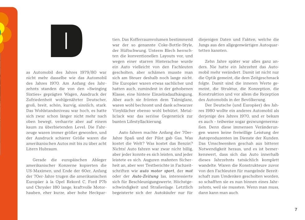 "So rollten die 70er" voert de lezer mee naar een decennium van grote omwentelingen in de auto-industrie. De auto, ooit een zorgeloze hobby, paste niet meer in de serieuzere tijdsgeest van de jaren 70. De oliecrisis, milieuvervuiling en stijgende ongevallencijfers drukten de pret. Roestbescherming was ook een issue, niet alleen voor Alfa Romeo, Fiat, Peugeot en consorten. Ook Opel, BMW, Mercedes, VW en Ford werden getroffen, waardoor veel auto's uit die tijd nauwelijks nog bestaan. Maar de foto's uit die tijd zijn bewaard gebleven. In plaats van geënsceneerde persfoto's bevat het boek authentieke kiekjes: vaak ongewassen, gedeukt en roestig. Deze beelden, als die uit een familiealbum, maken dit boek zo charmant en bieden een nostalgische terugblik op het tijdperk van de wijde broeken.