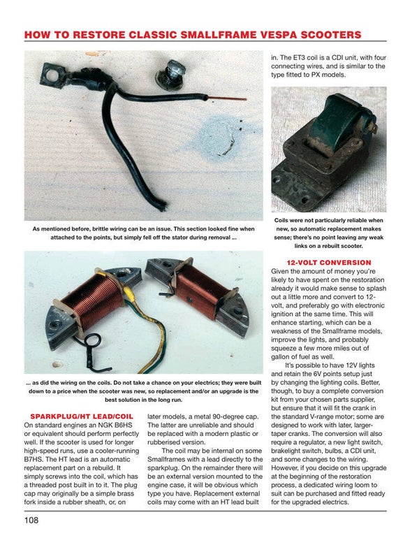Dit boek onderzoekt de realiteit van het renoveren van een Smallframe Vespa in detail, en beschrijft de technieken om een compleet wrak volledig fabrieksnieuw te herstellen. De restauratie wordt door de auteur in zijn eigen atelier uitgevoerd en alle stadia van het proces komen aan bod. Van framelassen en paneelreparatie tot schilderen en trimmen, elk proces wordt duidelijk beschreven en ondersteund door meer dan 600 kleurenfoto's. Speciaal gereedschap, advies over het gebruik ervan en zelfs mogelijke zelfgemaakte vervangers komen aan bod, samen met advies over reserveonderdelen - geen Smallframe Vespa-bezitter mag zonder een exemplaar zijn.