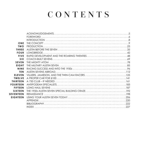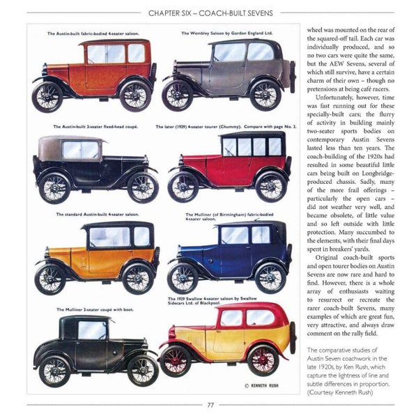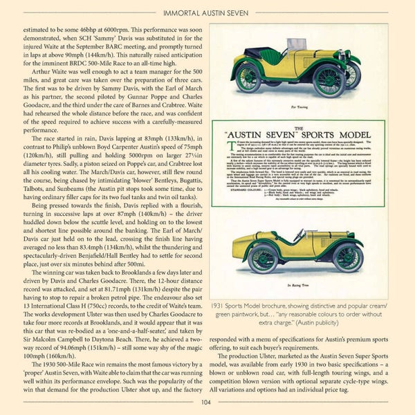 "Immortal Austin Seven" vertelt het verhaal van deze meest populaire vooroorlogse auto in al zijn variaties, van de vroegste Chummy uit de jaren 1920, via Sports, Military, Box en Ruby Saloons tot de voortreffelijke Twin Cam-racers uit de late jaren 1930. De Austin Seven was echt 'Motoring for the Millions' en de babyauto van Herbert Austin fascineert al bijna een eeuw lang duizenden enthousiastelingen, met de enorme verscheidenheid van meer dan 300 verschillende werken of carrosserievormen in 17 jaar productie. De Austin Seven-motor dreef ook vliegtuigen, boten, tractoren en motorfietsen aan en werd voor veel verbazingwekkende toepassingen gebruikt, allemaal beschreven in dit boek. Er is ook een sectie over het gebruik van de Austin Seven na de Tweede Wereldoorlog en de competitieve rol van de auto in proeven, heuvelklimmen en circuitraces, waaronder de verbazingwekkend succesvolle 750 Formula, die de carrières van beroemde mannen als Colin Chapman op gang bracht. Eric Broadley, Arthur Mallock en Tony Southgate, en de rage van het bouwen van sportieve Austin Seven "Specials" die een hoogtepunt bereikte in de jaren vijftig. Het boek bevat historische detailtekeningen en zelden geziene foto's, en biedt fascinerende lectuur voor zowel Austin Seven als autoliefhebbers.