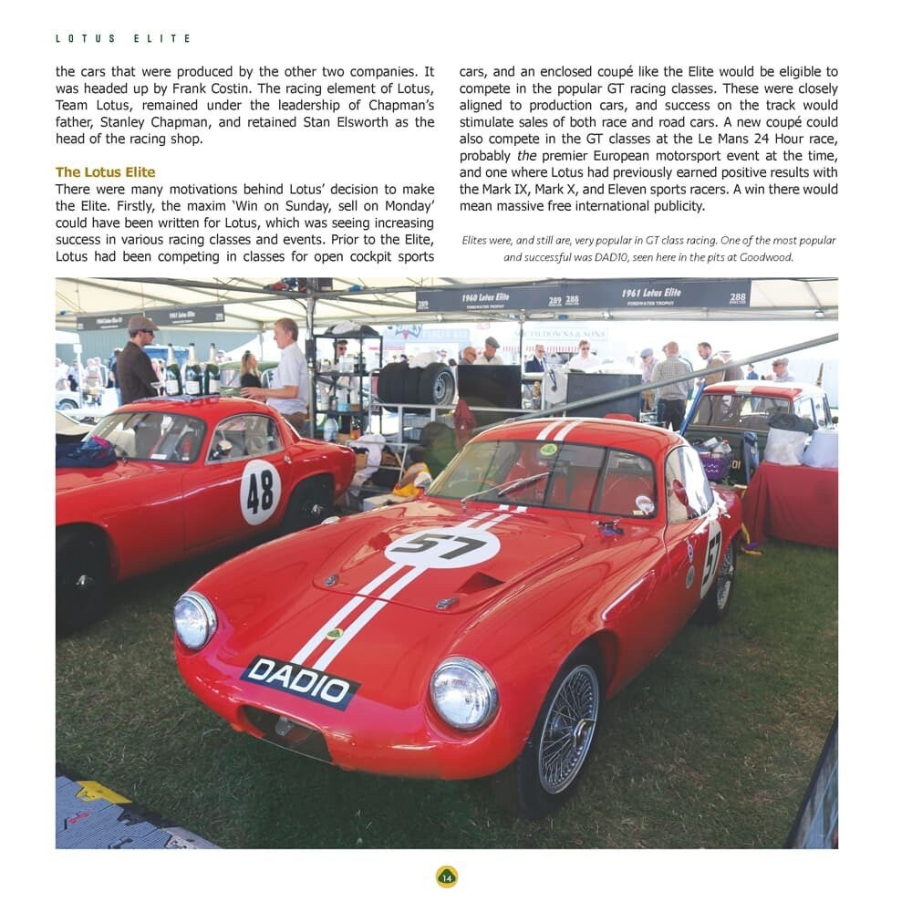 De Lotus Elite was een keerpunt voor Lotus. Het werd voor het eerst geproduceerd aan het einde van de jaren vijftig en markeerde de overgang van Lotus van een maker van kleine raceauto's, die weinig nut hadden op de weg, naar de producent van een zeer geavanceerde weg- en raceauto. In de Elite benutte Lotus zijn kennis van nieuwe technologie en race-stamboom om een auto te produceren die, met zijn monocoque van glasvezel en Coventry Climax-motor, het potentieel had om een wereldkampioen te worden. Dit boek geeft inzicht in de redenen waarom de auto werd geproduceerd en het belang ervan in de geschiedenis van Lotus, vooral bij de productie van lichtgewicht innovatieve auto's. Door middel van interviews met Elite-bezitters biedt het een goed overzicht van het bezit van een van deze iconische auto's, waarbij de zwakheden en eigenaardigheden worden behandeld, evenals de voorbeeldige wegligging en prestaties. Geïllustreerd met veel kleurenfoto's, samen met historisch reclamemateriaal, biedt het boek een waardevol inzicht in het bezitten, rijden en racen van deze iconische auto's.