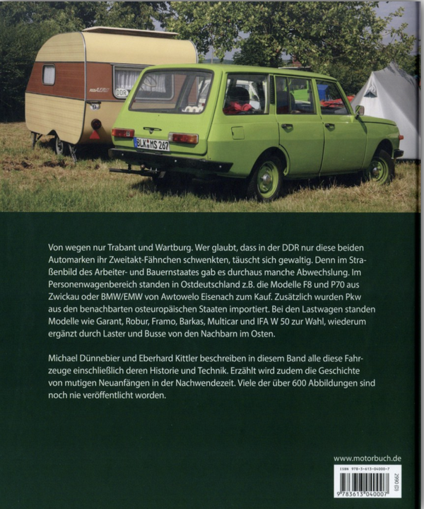 Vanwege alleen Trabant en Wartburg. Wie denkt dat alleen deze twee in de DDR met hun tweetaktvlag zwaaiden, heeft het mis. Want er was nogal wat variatie in het straatbeeld van de arbeiders- en boerenstaat. In de personenwagensector waren er bijvoorbeeld de F8-, F9- en P70-modellen van IFA of EMW van Awtowelo, evenals auto's uit naburige Oost-Europese landen. Onder de vrachtwagens bevonden zich modellen als Horch, Framo of Barkas, wederom aangevuld met vrachtwagens van de buren. Michael Dünnebier en Eberhard Kittler beschrijven al deze voertuigen en zelfs meer met hun geschiedenis en technologie en illustreren ze met ongeveer 600 afbeeldingen.